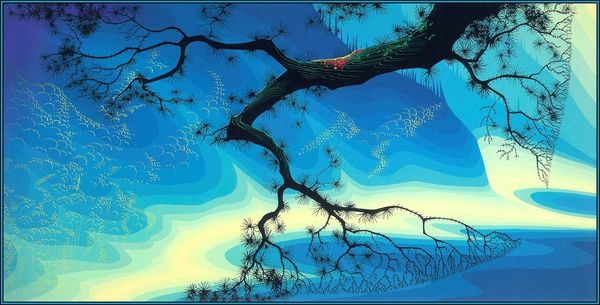 Editor: Here we have "Solitary Bonsai," a painting by Eyvind Earle. It's all lush greens and blues, depicting a lone tree in an almost geometric landscape. It has a certain melancholy to it. What do you make of it? Curator: The solitude is striking, isn't it? But it's crucial to consider how concepts like "solitude" are often romanticized while ignoring the imposed isolation experienced by marginalized communities. Look at the way this bonsai, a symbol often tied to elitist tradition and carefully controlled environments, is presented. How might its "solitude" be read not as serene self-sufficiency, but as a result of forced displacement from a more diverse, natural ecosystem? Editor: That's a fascinating point! So, you're saying its loneliness isn't natural but rather a consequence of something else? Curator: Precisely. We can interpret the cultivated, almost artificial, rendering of nature as a critique of how power structures manipulate the environment and displace those most dependent on it. What do the precise lines, the calculated composition suggest to you in that context? Editor: It feels almost sterile, despite the vivid color. As if the wildness has been carefully managed and contained. Curator: Exactly! And who benefits from this containment? Whose vision of nature is being imposed here? This forces us to question how notions of beauty and serenity are often used to mask underlying inequalities. Perhaps it reflects larger issues of environmental justice and the uneven distribution of resources. Editor: I never would have seen all that. It gives me a lot to think about. Thanks. Curator: My pleasure. Keep questioning the narratives you see in art and everywhere else around you.
