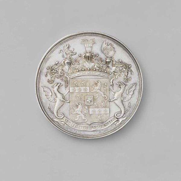 Editor: Here we have the “Electiepenning van de stad Leeuwarden, penning voor de electeurs van magistraatsleden,” a metal engraving from between 1734 and 1745 by Andele Andeles. It’s a baroque coin, really, but it also has elements of cityscape and history painting. What strikes me is the almost architectural rendering of the building. What do you make of the artist’s approach to composition in this piece? Curator: The visual organization relies heavily on symmetry and balance, features inherent in Baroque aesthetics. Observe the building's facade: its central axis is emphatically asserted, bisecting the composition into mirroring halves. The artist has rendered the details meticulously. The fenestration, the roofline, the doorway - each element is articulated with precision. Editor: It almost feels flattened, though, lacking depth. Is that deliberate? Curator: Precisely. Consider the surface quality. The artist prioritizes line and form over atmospheric perspective. The building reads more as a symbolic representation than a realistic portrayal of three-dimensional space. The lines are crisp and unwavering, delineating the contours of the building and surrounding text with remarkable clarity. How does this emphasis on linearity affect the overall reading of the work, in your opinion? Editor: I think it reinforces the idea of order and precision, aligning with the concept of civic duty or governance implied by the text. It gives the building an almost iconic, enduring quality. Curator: Indeed. The strategic deployment of form, line, and surface creates an image steeped in the ideology of its time. Such structural choices are rarely arbitrary; they resonate with intention. Editor: That's a fantastic point. I was focused on the representation, but considering the stylistic decisions brings out a whole new layer of meaning. Curator: Absolutely. Analyzing form opens new avenues into comprehending the artwork’s meaning and impact.