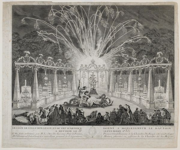Editor: Here we have "Design for the Engraving 'Réjouissances du Peuple...à Reims le 27 aout 1765'," created in 1767 by Jean Michel Moreau the Younger, it's a print using engraving and etching techniques. The gathering of the people around the monument looks energetic. What can you tell me about this work? Curator: Oh, this piece transports me! I see it not just as an historical record, but as a kind of dreamscape. Look at how Moreau uses light, almost theatrical in its intensity, particularly radiating from the monument. Does it feel like an ordinary celebration, or something more... staged, perhaps even divine? Editor: Staged is a good word for it; there is something artificial about how organized the party feels in contrast with the glow in the middle. Is there significance to the star at the monument’s apex? Curator: Ah, the star! It symbolizes, for me, hope, aspiration, and perhaps a touch of naive idealism so characteristic of the era. It contrasts sharply with the earthly revelry below. It asks, "What are we *really* celebrating?". It makes me wonder...was the artist truly celebrating royal grandeur or hinting at something more complex and less sanguine? What are your feelings about it? Editor: It's a clever contrast – that dazzling optimism above clashing with the chaotic energy of the crowd below. Maybe it speaks to the distance between the ideals of leadership and the reality of everyday life for the populace. Curator: Precisely! And isn't it fascinating how Moreau manages to embed that quiet commentary within what seems, at first glance, like a straightforward celebratory scene? That subtlety… that's the real magic here, a delicate dance of light, symbol, and implication. Editor: Definitely, noticing the nuance makes me appreciate how artworks can simultaneously depict and subtly critique the world they occupy. Thank you! Curator: It has been my pleasure! Art reveals secrets for those who know how to listen and see, after all!