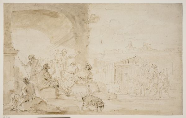 Editor: This is Willem Drost's "Peter and John at the Temple Gate," created sometime between 1626 and 1669. It’s an ink drawing on paper, and I'm struck by how the composition guides your eye through the architectural space. What stands out to you about the structure of this drawing? Curator: The composition relies heavily on the implied geometry of the architecture. Note how Drost employs linear perspective, creating orthogonals that converge toward a vanishing point, lending depth. Do you see how the figures are carefully positioned within this framework? Editor: Yes, Peter and John are centrally placed, anchoring the left side of the drawing. The beggar sits even further to the left, almost acting as a counterweight to the figures inside the temple. What do you make of the contrast between these figures? Curator: Consider the contrast in line quality. The beggar is rendered with more frenetic, almost scratchy lines, creating a sense of vulnerability and poverty. Peter and John, though sketched, are depicted with more deliberate strokes suggesting stability. The application of ink reveals tonal variations, emphasizing the light source. How do these visual cues affect your understanding of the narrative? Editor: I see that the varying line quality definitely enhances the emotional weight of each figure's situation, heightening the narrative’s contrast between the powerful and the vulnerable. It's a simple, yet effective visual strategy. Curator: Precisely. Drost has successfully manipulated formal elements to construct a powerful and affecting scene, showcasing the emotional capacity inherent within the graphic medium. Editor: I never would have noticed the line quality so closely without you pointing that out. Thank you! Curator: My pleasure. It is often in the nuances of line and form where the true genius of an artwork lies.