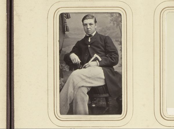 Editor: Here we have an albumen print, a photograph titled "Albert Edward" taken sometime in the 1860s by Jeremiah Gurney. It's strikingly composed, but also feels…distant. What stories do you see lurking in this image? Curator: The image certainly has a posed, studied feel, doesn’t it? We can see visual markers of Albert Edward’s status; the relaxed posture, the fashionable clothing. But consider also what is absent: dynamic engagement with the viewer. Instead, his gaze is slightly averted. This directs us to interpreting him more as a representation, an icon, rather than an individual. What kind of emotional or cultural impact would images like these have on 19th-century society? Editor: So, not just a likeness, but a carefully constructed persona meant to convey something specific? Curator: Precisely. And even the photographic medium plays a role. Photography at the time held an aura of objectivity and truth. The creation and circulation of these portraits helped in the manufacturing of fame and, later, celebrity, influencing perception and cementing social hierarchies. Do you find elements in the image that hint at any anxieties about class or legacy? Editor: Perhaps that slightly unsettling, almost wary expression? As if aware of being perpetually observed, and judged? Curator: An interesting interpretation. These photographic portraits contributed to constructing, reinforcing, and ultimately propagating very specific social narratives. Images are powerful transmitters of cultural values, anxieties, and aspirations. Editor: It's fascinating to consider how much an image can convey beyond just a simple depiction. I’ll never look at historical photographs the same way again. Curator: Indeed, by exploring the visual vocabulary of a time, we gain a better understanding of its dreams and demons.
