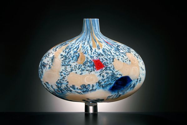 This is Louis Comfort Tiffany's "Lamp Shade (?)," currently held at the Metropolitan Museum of Art. The shade, standing just over 14 inches tall, presents a compelling study in contrasting forms and textures. The glass body of the shade swells with an organic fluidity, its surface alive with swirling patterns of iridescent blues, purples, and greens against a milky, opalescent background. These chromatic undulations create a captivating sense of movement, almost as if the glass itself is in constant flux. This ethereal quality contrasts sharply with the lamp's base, constructed from patinated metal. Its dense, filigree-like structure, seems to anchor the shade. Tiffany's mastery lies in his ability to synthesize seemingly disparate elements into a harmonious whole. The lamp transcends mere functionality, becoming a dynamic interplay of light, color, and form. The base provides a grounding counterpoint to the shade's ethereal qualities, allowing us to think about the relationship between the earthly and the sublime.
