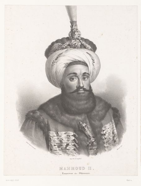 Editor: So, here we have "Portret van een heerser van het Mogoelrijk," or Portrait of a Ruler of the Mughal Empire, an engraving from between 1670 and 1713 by Pieter Schenk. I’m struck by the detailed textures achieved through engraving; it’s mesmerizing! How do you interpret this portrait from a formalist perspective? Curator: Note how the artist uses line and contrast to construct a hierarchy within the image. The ruler's ornate headdress, meticulously rendered with a profusion of pearls and feathers, immediately draws the eye. Observe the sharp, precise lines used to define the jewels, in stark contrast to the softer, more diffused lines suggesting the texture of his beard. What does this deliberate contrast communicate, structurally speaking? Editor: I guess it highlights the ruler’s wealth and status through the intense detailing, versus a more casual depiction of his beard and hair. Is the very clear inscription part of the structural design as well? Curator: Precisely! The inclusion of Latin text situates the image within a specific intellectual and political framework. Notice the arrangement of the text below the figure. How does it serve to anchor the composition, balancing the visual weight of the elaborate headdress? The lettering and lines add an orderly visual balance. Editor: That makes sense; it creates a solid base, framing the portrait. I hadn't really considered how integral the lettering was to the overall balance. Curator: Further, consider the oval frame. The form suggests a sense of enclosure and highlights the sitter’s prominence while simultaneously restricting and containing. The sharp border emphasizes the constructed, curated nature of this presentation of power. Editor: It's fascinating to see how every element contributes to the overall structure and meaning, and even the containment adds to the impression of strength. I never really looked closely at that inscription before, seeing it as just text, but it adds so much more.