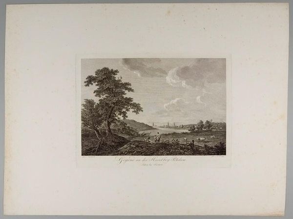 Curator: This is "Plate II" by Adrian Zingg, created sometime between the late 18th and early 19th centuries. Editor: It's a landscape that feels both vast and intimate at once. So airy and quiet. Curator: Zingg was a master of topographical art, and this work exemplifies his ability to capture a sense of place, likely for the rising middle class interested in landscape imagery. Notice the workers busy harvesting in the fields. Editor: They almost blend into the landscape, tiny and purposeful. It makes me think about the rhythm of the seasons, the constant cycle of work and rest, life and death. Curator: Absolutely, and it's a reflection of the socio-economic structures of the period, too, a world that’s both romanticized and grounded in labor. The rising middle class consumes the image while the working class labors in the field. Editor: A poignant reminder of the distance between seeing and doing, then and now.