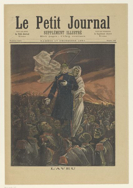 Curator: Here we have "Afweerfront; orgaan der rode hulp," a striking 1935 poster associated with the Rode Hulp. Its medium combines printmaking and graphic art elements. Immediately, I’m struck by the tension created by the red against the black and white, very Constructivist in nature. Editor: Yes, the stark contrast is the first thing that jumps out. It’s raw, urgent. Beyond the pure formalism of it, red traditionally symbolizes so many things. Here, the vibrant flag immediately recalls revolution and sacrifice but it could equally speak of fury. Red catches the eye, and in this context, it commands attention with its symbolic weight, representing resistance, but who do you imagine it's geared towards? Curator: Absolutely. And notice the central figure, a woman, bravely holding aloft that powerful red banner. In many ways the woman feels allegorical – mother earth even – as an organizing symbol, drawing strength from traditional imagery of hope but acting with determination in new cultural territory. In visual terms, the positioning of the Red Flag is brilliant too, breaking up an otherwise bleak composition. Editor: A clever visual motif, definitely! That flag acts as the vector in an otherwise disordered and bleak composition. This compositional focus draws the viewer to the figure and towards those men advancing behind. It creates a stark reminder of history, the text alludes to "De Commune van Parijs, 18 Maart 1871," while seemingly advocating for the antifascist refugee movements of the 1930s, but I wonder how this intertextuality shapes viewers understandings of justice in a wider field. Curator: I agree; seeing these symbols coalesce like that highlights not only the struggles of the past but also the urgent need for compassion and action in the present. It also encourages memory to shape viewers sense of meaning when they encounter it now. It becomes almost a talisman of political will and purpose. Editor: Precisely! A perfect distillation of form and cultural function into something profoundly moving and resonant, a perfect example of social realism if ever there was one! Curator: It's certainly given me pause to consider the poster's impact within its original cultural moment. I suspect this image has carried an important meaning that's helped guide the development of a cohesive cultural memory surrounding political activism. Editor: Yes, indeed. A potent message then, and its form, in all its radical starkness, lends it a remarkable power today.