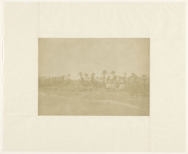 Curator: This haunting vista before us is a daguerreotype simply titled "[Egypt]", created between 1842 and 1844 by Joseph-Philibert Girault de Prangey. Editor: My first impression is one of tremendous stillness. There’s an almost sepulchral silence radiating from the composition, a heavy stillness hanging over the landscape. Curator: Yes, the stillness is striking. Note how de Prangey uses the horizontal format to emphasize the vastness of the scene. The buildings on the horizon are balanced by the reflecting pool, creating a rigorous symmetry. It's an intriguing tension between constructed and natural space. Editor: Absolutely, and the reflecting pool is incredibly evocative. Water, particularly in ancient cultures, symbolized creation, purification, and the passage between worlds. The reflected buildings take on an almost ghostly quality, as if peering into the past, perhaps a visual encoding of collective cultural memory. Curator: Fascinating point. It's also worthwhile considering the constraints of the daguerreotype process itself. The long exposure times would necessitate a static scene. Yet, paradoxically, the soft blur and limited tonal range lend an atmospheric depth that a more sharply focused image might lack. It's less about mimetic accuracy, and more about atmosphere and structural harmony. Editor: True. Beyond that, there is an elegiac quality here. We see these structures now as ruins, relics of an empire, yet through the lens of early photography they become immediate, present. A tangible reminder of civilization's cyclical nature. This medium creates its own visual symbols and mythologies, I believe. Curator: That idea of “mythologies” in visual culture strikes me as insightful here, but from my perspective I'm most struck by the interplay of horizontal and vertical, the manmade structures against the palm trees and reflecting pool; De Prangey appears to be composing with these pure geometric volumes, not documenting some literal “truth.” Editor: Ultimately, I feel that de Prangey’s “[Egypt]” exists as a powerful visual symbol reminding us of lost grandeur, cultural legacy, and the inevitable march of time—echoing still for nearly two centuries now. Curator: I agree entirely. While attending to these historical significances, its formal clarity is difficult to overstate; De Prangey achieved something masterful, not simply capturing a place but constructing a feeling.