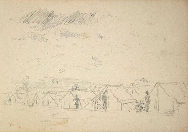 Paul Kane’s pencil sketch, "Lake Huron," captures a scene dominated by conical forms. These are the dwellings of the people who live there. Note how Kane's use of graphite creates a stark contrast between the dark, textured surfaces of the tents and the open, airy sky. This contrast is a key element in understanding Kane's perception of space and form. The composition is structured around these contrasting elements. The clustered tents provide a sense of mass and volume, while the sketch-like quality of the lines suggests a fluidity and transience. This duality reflects a broader discourse around the representation of indigenous life. The tents may appear stable, yet the delicate linework and shading suggest they are fleeting and ephemeral. The artwork's value lies not merely in its representation of a scene, but in its ability to engage with ideas of space, form, and representation. It encourages us to question what is shown and how it is perceived, acknowledging that an image can hold both descriptive and conceptual significance.