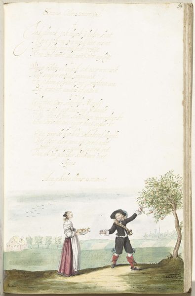 This watercolor by Gesina ter Borch, made in the seventeenth century, shows a lady and a gentleman in conversation, frozen on the page of a book. The gentleman extends his gloved hand, while the lady holds a fan, both common motifs in depictions of courtship. The fan, a symbol of status and coquetry, has ancient roots. Think of the flabella used in religious ceremonies, or the peacock fans depicted in Renaissance paintings. Over time, this object of utility evolved into a prop used in the dance of courtship. Its presence here speaks to a shifting social dynamic, one where objects become laden with unspoken meanings. The power of such gestures lies in their ability to convey complex emotions and social cues. This silent language transcends time, echoing through different cultures and historical periods, revealing the enduring power of symbolism in human interaction.