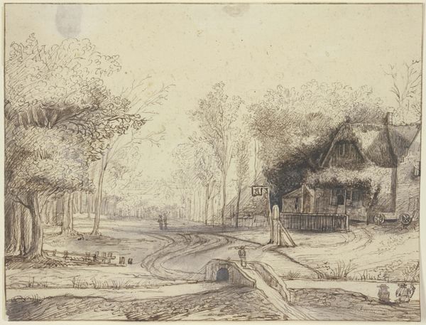 Editor: This is Jacob van Ruisdael’s drawing "Dorf mit Kirche an einem Fluss," or "Village with Church on a River" executed in pencil and ink. The overall impression is one of peacefulness and a bit of pastoral charm. What stands out to you as you observe this scene? Curator: It’s intriguing how Ruisdael uses familiar visual vocabulary—the church, the river, figures—to tap into our collective memory of a simpler, more idyllic past. Notice how the church, usually a symbol of stability, is softened by the surrounding foliage. Does that affect its cultural weight for you? Editor: I hadn't thought about that, but it does. It makes it feel more integrated into the landscape, less imposing. Almost as if it's another cottage. Curator: Precisely. Consider, too, the psychological impact of water. The river, rendered with such intricate detail, speaks of constant change and the passage of time. Water can be both life-giving and destructive. Do you see evidence of that duality here? Editor: Hmm, I guess the slightly rough rendering around the falls shows that sense of force. It's not just a smooth, gentle flow. Curator: And what about the figures? The suggestion of everyday life reinforces a connection to community, but also transience. How do they anchor or destabilize your reading of the image? Editor: They almost feel like afterthoughts. They add scale, but don't really draw focus, making the scene less about people, more about the place. Curator: Indeed. The artist isn’t necessarily prioritizing human drama but the symbolic language of the setting. Ultimately, the drawing acts as a portal, inviting us to contemplate the layered meanings embedded within seemingly simple scenes. Editor: That makes me look at landscapes so differently, thinking about how much information and emotion can be packed into them! Curator: Absolutely. Every element resonates and reflects our understanding of the world and ourselves, culturally, psychologically and personally.
