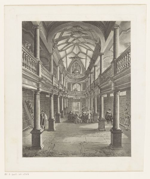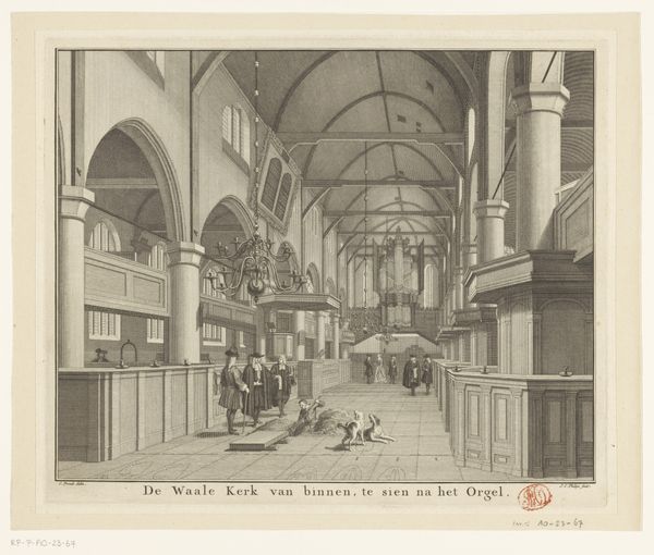 Curator: This print, titled "Interior of the Walloon Church in Amsterdam, seen towards the main entrance," offers a glimpse into 18th-century Amsterdam. Jan Caspar Philips created this between 1736 and 1759. Editor: It’s an expansive view, wouldn’t you agree? The immediate sense I get is one of grandeur, a quiet monumentality, evoked by the sheer scale and the meticulously rendered architectural details, such as the impressive arched windows. Curator: Absolutely, and Philips's use of perspective is striking. The church, serving as a vital religious and social hub for Amsterdam's Walloon community, visually underscores the church’s role in integrating French-speaking Protestants into Dutch society. Editor: Indeed. Formally, this has much to do with the almost exaggerated orthogonals that pull our eye towards the back, reinforcing this deep architectural space with a theatrical sense of Baroque drama. There are anecdotal, small vignettes playing out as well. Curator: These aren't merely stylistic choices, though. The positioning of the figures – their clothing, activities – give us invaluable information about daily life and social customs. This imagery helps to establish their status and what behaviors were deemed appropriate in public sacred spaces at the time. Editor: It's fascinating how he utilizes a somewhat limited palette to highlight spatial depth. Light and shadow across the architecture establish a structuralist, linear framework throughout. Curator: Exactly. What is striking is that he has not merely portrayed the structure of a building. This artwork provides a powerful insight into the socio-cultural context in which it thrived. We see through this image, how these places help define community. Editor: Yes, and what appears on the surface to be documentation carries this more deeply-considered structure of light, perspective, and social awareness. A seemingly simple piece has a profound depth.