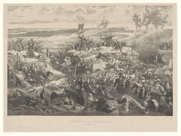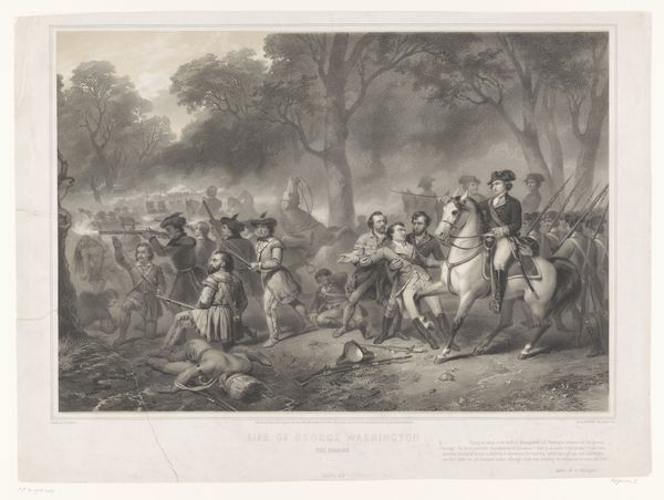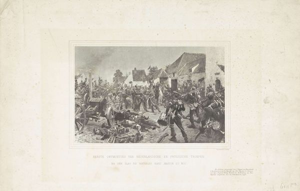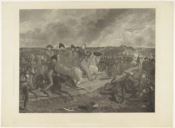 Editor: So, here we have "Prins Frederik raakt gewond bij Wervik, 1793", made between 1793 and 1795 by Christian Forssell. It’s an engraving, full of chaotic energy. What do you see in this piece, beyond the obvious battle scene? Curator: Beyond the battle itself, I see a careful construction of power and trauma. Consider the moment it captures: Prince Frederik's injury. This print, produced during a time of immense social upheaval in Europe, frames personal sacrifice within a narrative of national identity. Who benefits from representing the Prince in this way, and what political messages are being encoded through this image? Editor: That's interesting. It feels like it's glorifying war, almost? Curator: Indeed, but who is this glorification for? The intended audience plays a key role in deciphering this. Was it meant to rally support for the Dutch cause? Did it serve to consolidate power among the ruling elite by portraying them as valiant protectors of the nation? And how does the aesthetic – its Neoclassical composition, reminiscent of grand history painting – contribute to these ideological aims? Editor: So it’s not just a historical record, it’s actively shaping perception? Curator: Precisely. It is also crucial to acknowledge that images of war, like this one, often exclude or minimize the perspectives of those most vulnerable in conflict. Consider those in the lower portion of the engraving, seemingly injured, what does it tell us? Where are their stories within this dominant narrative of heroism? What does this representation elide about the realities of warfare? Editor: I hadn't really considered it in terms of who it’s *for*. That changes everything. Curator: It's about understanding the visual strategies that reinforce certain power structures. Examining art through the lens of social and historical context unveils these hidden dialogues and complexities. Editor: Thanks, I’ll definitely think about that approach from now on!
