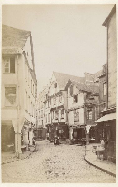 Editor: This albumen print, "Straat in Vire met op de hoek Café Durand," taken in 1901 and attributed to Delizy, depicts a quiet street scene. It feels almost dreamlike because of the soft focus. What strikes you most when you look at this image? Curator: The photograph’s romantic portrayal of daily life in Vire, France, invites a deeper look at the power structures inherent in seemingly mundane scenes. Notice how the architecture dwarfs the people; it silently communicates a social hierarchy. I'm especially interested in that Café Durand. What role do such public spaces play in shaping community identity and even resistance in this era? Editor: I see what you mean. The cafe seems to be a focal point, but the people appear more like passersby than participants. Curator: Precisely! And who are these passersby? The absence of visible labor, the dress of the figures suggest a certain class. The photograph implicitly constructs a narrative of leisure and privilege. How might this idyllic image mask the realities of economic disparity and social stratification in early 20th-century France? Editor: So, while the photo presents a charming scene, it might also be unintentionally highlighting social inequalities? Curator: Exactly. Photography isn’t merely a reflection; it's an active participant in constructing reality. This photograph of a street scene is laden with the cultural and social assumptions of its time. Think of Walter Benjamin’s writings on art and mechanical reproduction: Does this photo democratize art, or reinforce social hierarchies? Editor: I never thought of it that way before. I was just seeing a pretty picture! Now, I’m seeing that there's more to unpack regarding its historical context. Curator: It’s about digging beneath the surface and questioning the narratives embedded within. The act of observation itself is never neutral. Editor: This has really changed how I'll look at photographs from now on.