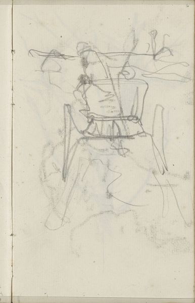 Curator: This is a pencil drawing entitled "Figuur op een paard en wagen," which translates to "Figure on a horse and cart," by Johan Hendrik Weissenbruch. The piece dates between 1834 and 1903. It's currently held in the Rijksmuseum collection. Editor: It’s so light, almost ephemeral. A quickly jotted sketch. It captures a feeling more than a detailed scene, I think, quite raw and direct. Curator: Exactly, this sketch provides insights into the artistic process during the late 19th century, when artists began emphasizing more spontaneous modes of expressions over academic formalism. The subject matter here represents an interesting social commentary. Editor: Interesting to me how exposed the process is. The texture of the paper comes through—you can practically feel the artist's hand moving across the surface. How did the availability of these sorts of inexpensive drawing materials influence art-making at this time? Curator: It democratized the visual arts. Weissenbruch captured the spirit of ordinary life, elevating everyday moments through his skill. Remember, this period saw increased urbanization and changing social structures, leading artists to engage more directly with scenes of daily life. The act of drawing was transforming from a preparatory tool to a legitimate artistic expression. Editor: I’m particularly interested in that cart's wheel. It looks almost casually rendered, yet you get a complete sense of its roundness and mass. You understand that the construction is made up of wood and iron, how materials are put together. What strikes you about the economy of line in relation to the function it portrays? Curator: What strikes me is how rapidly societal roles and interactions transformed. Art historians look at how such images were circulated, displayed, and how their accessibility changed over time to influence taste and understanding about aesthetic conventions. Editor: Thank you, I love the look and feel of art making from a production perspective. I can certainly now consider other historical viewpoints. Curator: It's vital for people to comprehend artwork. Analyzing history together helps me better appreciate this wonderful piece.