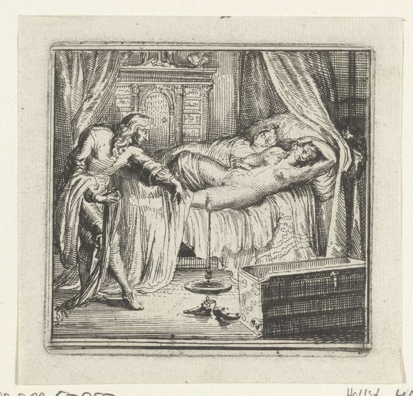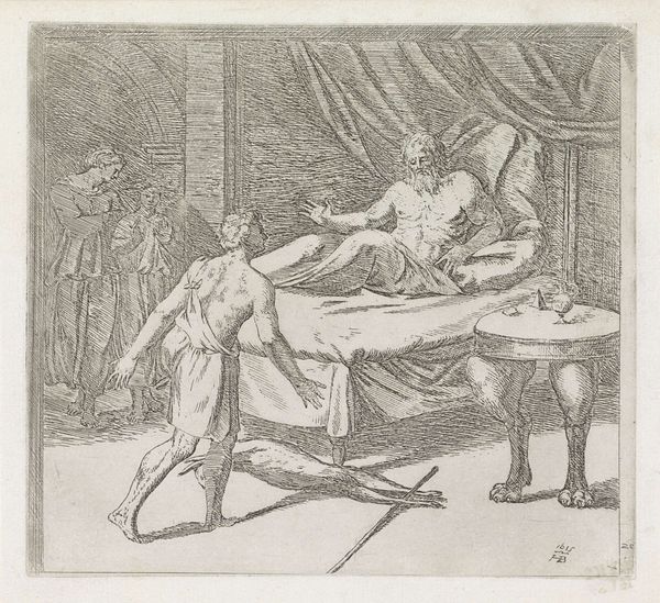 Cesare Fantetti created this engraving, titled "Isaak belooft Esau een tweede zegening," around the 17th century. It depicts a scene from the Hebrew Bible, where Isaac promises Esau a second blessing. Produced in the Netherlands, this work reflects the cultural interest in religious narratives during that era. The Netherlands, with its strong Protestant identity, saw the proliferation of biblical imagery in various art forms. Fantetti's work contributes to this visual tradition, offering a glimpse into the religious and social values of the time. The institutional context of printmaking, with its reliance on patronage and dissemination through print culture, shaped the production and reception of such images. To fully understand this work, art historians delve into textual sources, examining how biblical stories were interpreted and visualized in different cultural contexts. By exploring the institutional frameworks and cultural milieu in which it was created, we gain insights into the meanings and significance of Fantetti's engraving.