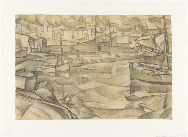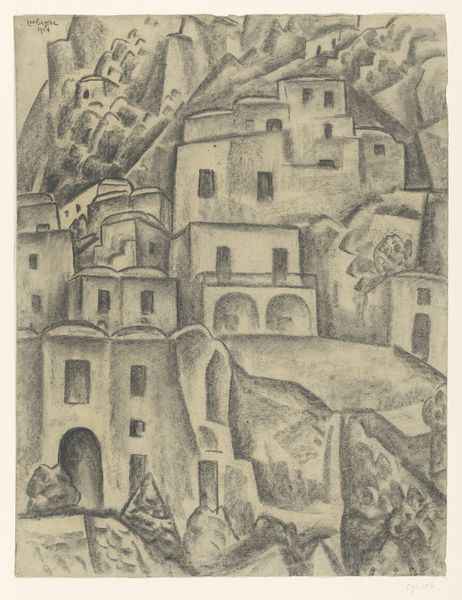 Curator: Here we have Leo Gestel’s 1924 drawing, "Gezicht op Positano," or "View of Positano." Gestel rendered this cityscape in graphite on paper. Editor: It strikes me as a somber yet sturdy vision. The architectural forms, though softened by the medium, possess a palpable sense of permanence. Curator: That somber tone is interesting given when this was created, at the beginning of his more abstract work following a dark period when Gestel was impacted by the death of his wife, and when his works weren't exhibited. This image reflects a broader early 20th-century grappling with societal change through artistic expression. Editor: I see the cultural connection there. The repeated rectangular forms hint at solidity. Windows and doors stand out. It's a town perched impossibly on the mountainside, an arrangement of human intervention against a vast landscape. I sense a yearning for community represented here. Curator: Indeed. Note Gestel’s subtle manipulation of perspective. He's using a flattened picture plane typical of modernism, in an attempt to create visual rhythm and symbolic impact, rather than perfect realism. That relates to interwar longing. The Great War had leveled Europe's established cultural landscape and society as people knew it. It makes sense the architecture reflects the idea of recovery from ruins. Editor: Right, and that reconstruction would've relied on strong symbolism. Each archway, each repeating shape of a home stacked up the hill, can be viewed as a symbolic suggestion of the interconnected fates of a people as they try to come together after disaster. Curator: An interesting idea. In many ways, what we see in Gestel's depiction of Positano are not simply buildings, but the bones of something being built again. Editor: So it goes back to what I was initially alluding to - a stoic but sturdy vision that hints at how people connect and overcome. Gestel invites us to see through the individual stones and roofs to appreciate the whole. Curator: It's interesting to consider it in those terms. It shows how a pencil drawing of a city view also mirrors back ideas around resilience and connection.