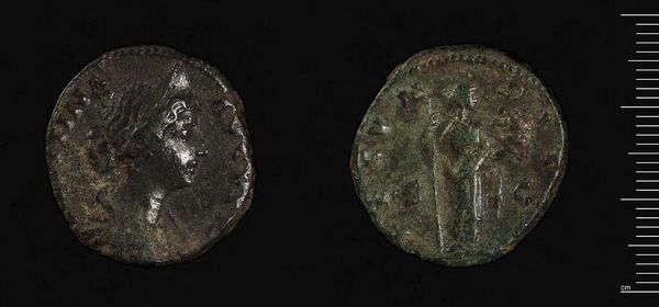 Curator: Let's discuss this Antoninianus of Cornelia Salonina, a Roman coin currently held in the Harvard Art Museums. Its small size belies a world of meaning. Editor: My first impression is one of wear. The metal is weathered, the details softened, but the fundamental imagery remains, creating a tangible link to the past. Curator: Indeed. The coin gives us insight into the imperial cult and economy of the time. The figure, presumably Salonina, offers a glimpse into the representation and idealization of imperial women. Editor: And I see the formal arrangement—the profile portrait versus the standing figure—creating a visual dialogue. Curator: We shouldn't forget the production process. Minting, distribution—the coin's journey through various hands and its impact on the Roman world. Editor: And yet, the coin's worn state speaks to its existence beyond its economic function—a testament to its inherent aesthetic qualities. Curator: It's a reminder that value isn't just monetary. Editor: Precisely, it has an aesthetic resonance that transcends its origins.