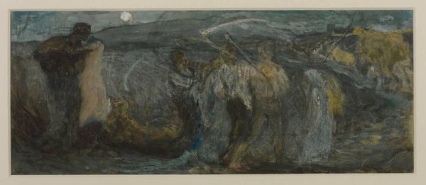 Curator: Charles Murray, born in 1894, made this work, titled "Russian Soldiers." Editor: It feels immediately like a scene of hardship. The diagonal lines create a sense of harsh weather. Curator: Murray's choice of gouache on paper really contributes to that feeling. The rough texture of the paper and the opacity of the gouache evoke a sense of grit and struggle. The application feels quite hurried, doesn't it? Editor: It does. The depiction of the soldiers on sledges suggests a logistical challenge, perhaps a retreat. Knowing the historical context could reveal commentary on the First World War, or maybe even the Russian Revolution. Curator: Indeed. And consider the social impact this image might have had; Murray's work presents war not as glorious, but as a brutal exercise in material and human cost. It challenges notions of heroism. Editor: It makes you think about the role of artists in shaping public perceptions of conflict, and how museums choose to exhibit these narratives. Curator: A powerful reminder of the lived experience of soldiers caught in larger socio-political machinations. Editor: Absolutely, a glimpse into the past that prompts reflection on the present.