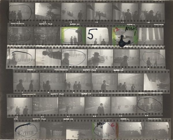 This photographic contact sheet, "City of London 6," by Robert Frank captures a series of images of London life. The visual language of the city street is dominated by figures wearing hats, which become a striking motif running through the sheet. Consider the hat: once a marker of status, profession, and identity. This motif carries echoes of the past, reminiscent of the bowler hats of clerks and merchants, symbols of the rigid social structures of Victorian London. Note how these hats evoke earlier depictions of city life by artists like Daumier or Hogarth, yet now appear in a fragmented, modern context. This repetition of the hat, across different frames, evokes the idea of collective memory and how subconscious symbols can become powerful cultural markers. The hat, once a proud assertion of identity, now echoes a sense of anonymity. This emotional weight, embedded in the visual symbol, engages us on a subconscious level. It's a fascinating example of how cultural symbols evolve, resurface, and take on new meanings across history.