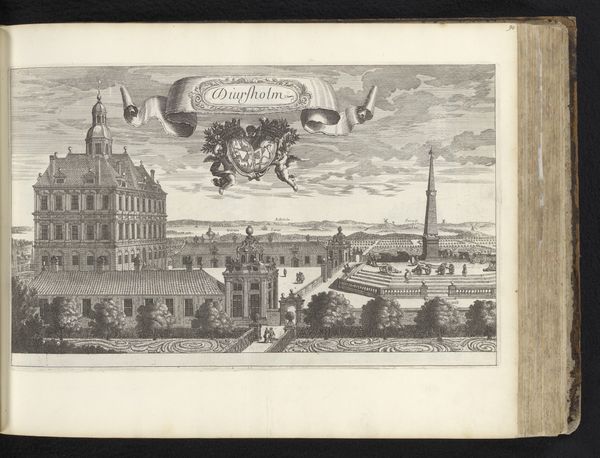 Editor: Here we have Adam Perelle's "Gezicht op kasteel Mörby," an engraving from somewhere between 1670 and 1674. It’s so precise and orderly – it almost feels like a stage set. What strikes you about this piece? Curator: It’s funny you say “stage set,” because that’s exactly how I perceive baroque landscapes; less 'picturesque' and more carefully constructed narratives. This reminds me of strolling through Versailles! You get a glimpse of the castle elevated in the background with these beautifully articulated geometric garden elements. What secrets might those sculpted hedges and meandering pathways conceal? Editor: That's such a great analogy! Now that you mention Versailles, I notice the tiny figures, placed with such meticulous care within the manicured gardens. What is their purpose here? Curator: Think of them as players in this theatrical landscape, meant to evoke status, leisure, maybe a bit of courtly intrigue. The very rich doing what the very rich do…It's interesting to note that the landscape is as important as the castle itself here, it’s all about power, possession and display, isn't it? Editor: It’s starting to seem almost artificial, but in a fascinating way! What would it be like to have this view and imagine the daily life in this castle? Curator: Exactly! The allure lies in the carefully crafted illusion. So often, our desires hinge on wanting the illusion, which, when you think about it, says a great deal about us. Food for thought, no? Editor: Absolutely, that reframes it entirely for me. I came in thinking "organized landscape," but now I'm thinking about power, theater, and even human desires! Curator: Isn't it brilliant when a piece reveals that the reality isn’t necessarily what it appears? Art has an exceptional capacity for this kind of unveiling, no?