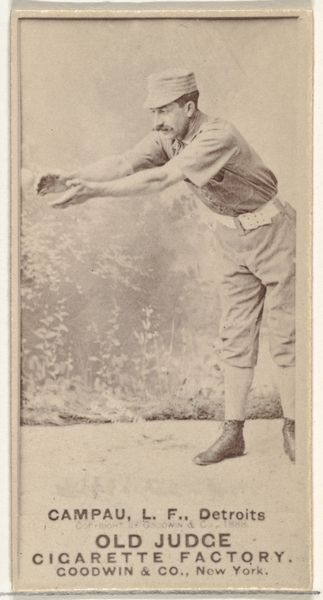 This is a baseball card of Al Maul, a pitcher for Pittsburgh, produced by Goodwin & Company for Old Judge Cigarettes, sometime in the late 19th century. It's a small piece of printed ephemera, but it speaks volumes about the social conditions of its time. The image links the burgeoning sport of baseball with the booming tobacco industry, both hallmarks of late 19th-century American culture. Note the emphasis on individual players, suggesting the rise of celebrity culture and the commodification of athletic prowess. This card served as a promotional tool, embedding itself within consumer culture. To understand the card's full significance, we might delve into the history of advertising, the rise of baseball as a national pastime, and the social impact of tobacco consumption. Art historians can contextualize this image by exploring advertising archives and the institutional history of baseball. Ultimately, this card reflects the economic and cultural forces shaping American society at the time.