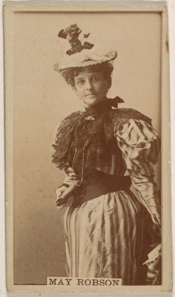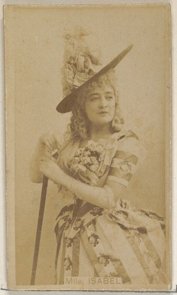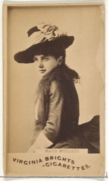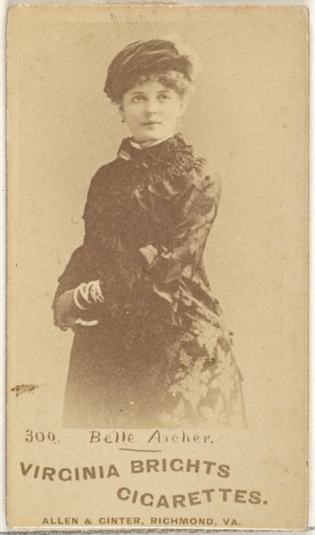 Editor: This is a small, photographic print from between 1886 and 1890, "Mlle. Renain, Paris, from the Actors and Actresses series (N171) for Gypsy Queen Cigarettes," created by Goodwin & Company. It’s interesting that it's an advertisement. How do you interpret this portrait in its historical context? Curator: That's an important point. This image existed within a burgeoning celebrity culture, fueled by mass media. These cards, inserted into cigarette packs, democratized access to images of performers. But who was given access, and who was represented? Let’s consider Mlle. Renain: likely a white European actress, her image reinforces dominant beauty standards of the time. How might this kind of image normalize certain ideals while marginalizing others? Editor: So it's not just a portrait of an actress, but also a reflection of societal values being spread through consumer goods? Curator: Precisely. The card is Ukiyo-e inspired, yet the appropriation of a non-westernized style served the marketing agenda. Also consider the "Gypsy Queen" brand itself, evoking orientalist tropes for exotic appeal, while potentially exploiting and misrepresenting Romani culture. This photograph, then, becomes a site where issues of representation, cultural appropriation, and commercialism intersect. What do you think about how contemporary artists explore these themes in relation to advertising today? Editor: It gives me a lot to consider; it shows how historical marketing connects to modern concepts of media criticism, something I had not previously thought of! Curator: Exactly! These artifacts allow us to critically examine the power dynamics embedded in seemingly simple images. The sale and consumption of such products promoted societal biases of the time. Editor: Thanks, I never considered commercial art as having this depth!