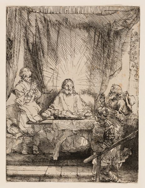 Editor: This is Rembrandt van Rijn's etching, "Christ at Emmaus: the Larger Plate." It’s so rich in detail despite the monochromatic palette! The scene feels incredibly intimate. What catches your eye in this piece? Curator: You know, that radiating light emanating from Christ? It’s not just divine; it’s as if Rembrandt is trying to capture the exact moment of recognition, that "aha!" feeling when the veil is lifted. Doesn't it remind you of a stage, perfectly lit for a dramatic reveal? Editor: Absolutely, that illumination really heightens the sense of drama and revelation. Curator: Rembrandt was a master of psychology, wasn't he? He invites us to witness the transformation in real-time. It makes you wonder about your own moments of sudden insight.