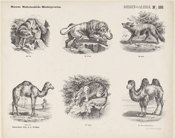 Editor: Here we have "Ruminants or Cloven-Hoofed Animals" by Arie Willem Segboer, a lithograph print from around 1903 to 1919. It's fascinating how this single image holds so many different animals—each set within its own vignette. What strikes you most about this composition? Curator: What immediately resonates is how each animal isn’t merely depicted, but presented as a cultural shorthand. Segboer isn’t just showing us a camel or a cow; he's invoking centuries of human interaction, domestication, and symbolic association with these creatures. Look, for instance, at the camel next to a depiction of an idyllic background including palm trees, the goat with the mountains. What do you observe? Editor: I see it now, they're placed within environments evoking where they might be found, maybe alluding to what they signify in those cultures! The ram with its curling horns is posed heroically on its little patch of grass! How did naturalism and cultural memory play into children's prints such as this? Curator: Precisely. The use of naturalism gives the image an aura of scientific authority while the environments work like cultural touchstones. For children of that time, these animals weren't just zoological specimens; they were laden with meaning. Think about it: the cow represents agrarian life and sustenance; the ram symbolizes strength. Do you see how this reinforces certain cultural narratives for young viewers? Editor: Definitely. I hadn't considered how educational prints like these also work to shape our understanding of animals in the world and the values we associate with them. I am going to think differently about how "naturalistic" imagery still can be so powerfully symbolic! Curator: I'm glad to have illuminated this rich area! Recognizing how visual culture reinforces collective cultural values is the beginning of critically understanding the art and images that shape us.