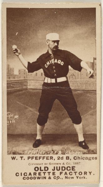 This is an albumen silver print made in the United States, around 1887, by Goodwin & Company. It features Abram Harding "Hardy" Richardson, left fielder for the Detroit Wolverines, and was part of a series of baseball cards included in packs of Old Judge Cigarettes. What strikes me is the complex intersection of commerce, celebrity, and sport in this small image. The Goodwin company leveraged the rising popularity of baseball to promote their product, embedding the players within a culture of consumption. But it also speaks to the institutional history of the sport itself. The rigidly posed figure, the formal backdrop, and the commercial framing all tell us something about baseball’s construction as a respectable and marketable spectacle in the late 19th century. To really understand this card, we'd need to delve into business archives, baseball history, and the visual culture of advertising at the time. The meaning of this seemingly simple image is found in its rich social and institutional contexts.