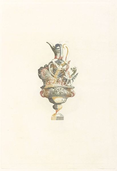 Editor: Here we have Raymond E. Noble's "Stone Fountain," created in 1939, rendered in watercolor and charcoal. It strikes me as almost melancholic, a beautiful object tinged with decay. What stands out to you most in this piece? Curator: I see a compelling tension here. On one hand, the fountain represents civic pride and idealized beauty, a planned imposition onto the landscape, suggesting control and even a kind of authority. On the other hand, we see signs of disrepair and nature reclaiming it – moss, discoloration. I wonder about its relationship to the power structures that would commission such an object in the late 1930s? Do you see how this reflects social hierarchies or ideologies of the time? Editor: I didn’t consider that at first. So you’re suggesting the fountain, even in its dilapidated state in this rendering, hints at systems of control? Like, who had access to public amenities and who didn't? Curator: Exactly. Public art isn't inherently neutral. Consider how fountains, in particular, have historically served as gathering places but were also often regulated spaces, reflecting social stratification. Who was allowed to linger, and who was moved along? Does the fact that this one is no longer functioning – or is presented as such – speak to shifts in those power dynamics, a critique maybe? Editor: That’s a very different way of seeing it than just a pretty fountain. It almost becomes a symbol of lost authority or a reminder of inequalities. It makes me rethink the intention behind depicting it this way. Curator: Precisely! And questioning intention is key. Art serves as a window into the cultural landscape of its time, inviting us to dissect and confront prevailing narratives. Editor: I'll definitely remember to dig deeper and think about these contexts moving forward. Thanks for the insightful perspective.