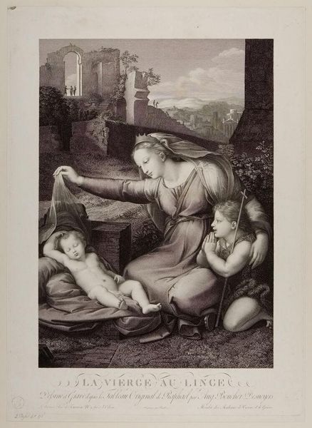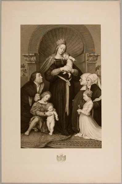 Editor: This is Herbert Bourne's "Henrietta of Orleans," housed here at Harvard. It's a fascinating image. The details in the dresses are incredible. What do you make of the composition? Curator: The linear perspective converges to Henrietta's face, immediately drawing the eye. Note how Bourne uses tonal gradations to define form and texture; it's a delicate dance between light and shadow. Observe also the strategic placement of the flowers mirroring the ornate fabric patterns, creating a visual echo. Editor: It feels very staged, almost artificial. Curator: Indeed. The arrangement, though visually pleasing, prioritizes formal qualities over naturalism. Notice how each element contributes to a unified aesthetic rather than a realistic depiction. Editor: I see that now. The formal balance is quite striking. Curator: Precisely. The work’s success lies in its meticulous construction of visual elements. Editor: I appreciate understanding the relationship between the subjects and the scene, and how it brings everything together.