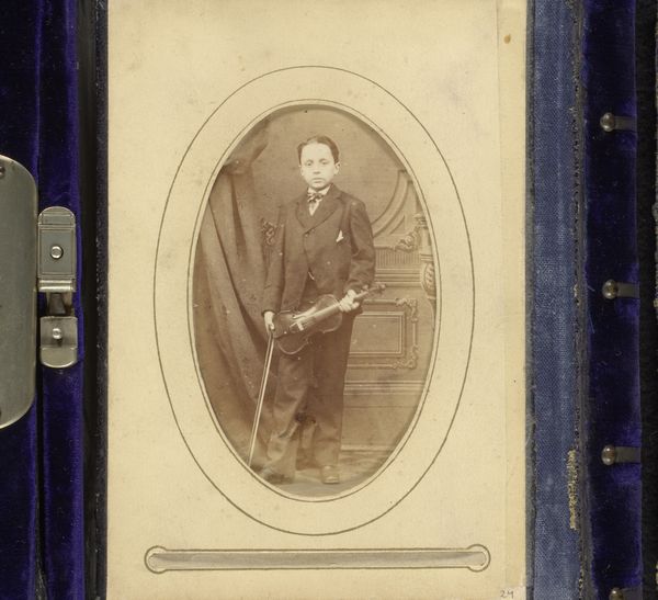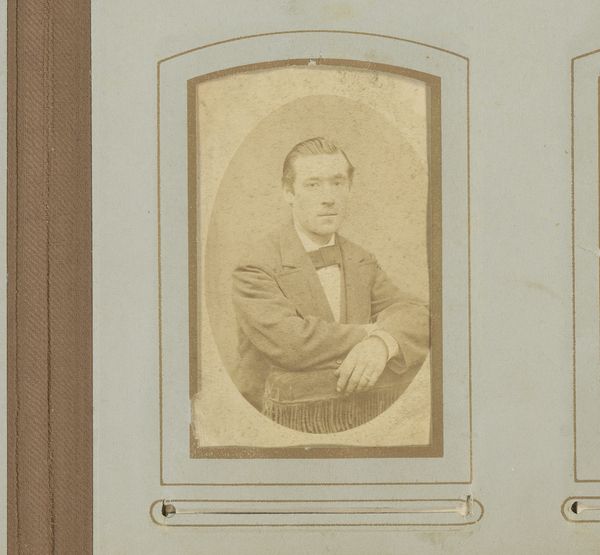 This is Albert Pestre’s small portrait of a man, likely a carte-de-visite. Encased in a decorative album, it's a study in subdued tones and structured composition. The oval vignette isolates the subject, drawing our eye to the textures of his suit and the careful arrangement of his pose. Notice how the light catches the subtle patterns of the fabric, creating depth within the limited tonal range. The very structure of the image—the framing, the pose, the controlled lighting—speaks to the social codes of representation at the time. This isn't just a likeness; it's a carefully constructed image designed to convey status and respectability. Consider how such formal portraits, though seemingly straightforward, engage with broader questions of identity, performance, and the gaze. The act of viewing becomes a dialogue, inviting us to consider the layers of meaning embedded in the photograph.
