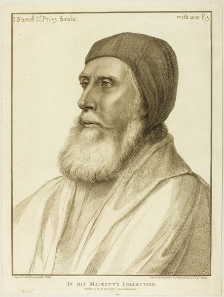 Curator: Here at the Art Institute of Chicago, we're looking at "Sir Gawin Carew," a print created by Francesco Bartolozzi. The piece, dating to around 1796, uses engraving on paper. Editor: It has such an ethereal quality, almost as if he's a benevolent spirit watching over us. And the detail in his beard is extraordinary. I immediately wonder about the weight that much facial hair carries, both literally and symbolically. Curator: You’ve keyed into something interesting. Beards, throughout history, often signified wisdom, virility, or status. And here, the sheer length and detail meticulously rendered by Bartolozzi really emphasizes that gravitas. Editor: Absolutely. And his gaze, so intensely focused, but directed slightly off to the side... It creates a sense of thoughtfulness and, perhaps, even a hint of melancholy. Is this the look of a man burdened by some heavy secret? Curator: It’s a clever pose. Academic portraiture of this era was carefully constructed to convey certain virtues or aspects of the sitter's character. By looking away, Sir Gawin isn't confronting us directly. This avoidance allows us to interpret his inner world and project meaning onto him. Editor: Like an invitation into his consciousness! The slightly softened lines created by the engraving enhance this inviting mood. But tell me, is there a cultural narrative associated with Carew? I'm drawn to uncovering how figures like him have been remembered or perhaps even mythologized. Curator: Gawin Carew served as a gentleman in King Henry VIII’s Privy Chamber in the 16th century. His story is woven into that turbulent period of English history, including his later involvement in conspiring to promote the Exeter Conspiracy against the king. Knowing this piece belonged "In His Majesty's Collection", adds to the mystique as well. Editor: Amazing how all these subtleties enhance the viewing experience. We’ve wandered through centuries! What began as an aesthetic experience unveiled itself to become something historically tangible and so rich in meaning. Curator: A perfect testament to the lasting power of visual symbols and their endless potential for meaning.