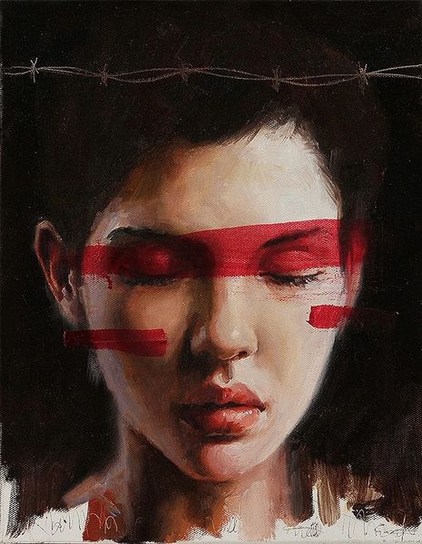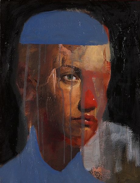 Curator: This is Adam Caldwell’s "Garland," created in 2016. Caldwell works with acrylic and oil on canvas, layering fragmented portraits and patterns. Editor: My first impression is one of subtle defiance. The dark, heavy swathes of color framing the portrait clash with the delicate floral crown, creating an unsettling harmony. Curator: I find it interesting how Caldwell builds up the figure. You see this push and pull between careful rendering and then these abrupt, almost violent, interruptions of color. Look at how the face is constructed, and how a stroke of blue seems to almost erase the brow. The materiality is really doing something here. Editor: Right, and this fragmentation speaks to broader narratives about identity construction, especially for women of color. The garland, a symbol of celebration and perhaps even innocence, is contrasted with this deconstructed portrayal, suggesting the pressures to conform while grappling with internal conflicts. Curator: The red and black bands are also intriguing in their relationship to the figure. It is not immediately clear if these elements exist in the same plane. Caldwell intentionally flattens the image, directing our attention to the constructed nature of portraiture itself. There’s a constant shifting between foreground and background, making you consider the physical processes employed. Editor: Yes, this certainly begs questions around cultural commodification and representation. Is the "garland" merely decorative, an exoticized element? Or does it reclaim agency for the subject, asserting her presence despite—or even because of—the fragmented depiction? It disrupts any easy reading, placing the onus on us to unpack layers of meaning. Curator: Thinking about Caldwell’s larger body of work, one could really explore this push and pull he orchestrates. How his choices regarding paint application—the very physical act of layering and obscuring—shape our understanding of not just who is portrayed but the mechanics of image-making. Editor: It invites us to really consider the gaze, whose expectations we are fulfilling, and whose narratives are being amplified, or suppressed. I keep wondering what this means for Asian women navigating the complexities of representation in Western art. Curator: It has made me think more about the ways materiality and image can subvert expectations of both traditional and modern portraiture, blurring boundaries, disrupting our engagement. Editor: I agree; for me, the piece serves as a reminder of the urgent need to continue questioning representation within larger societal power structures.