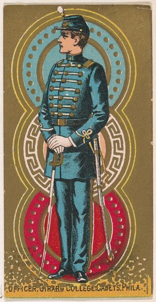 Curator: I’m struck by how self-assured the figure seems in this late 19th-century portrait. Editor: It certainly has presence. There's a blend of the theatrical and the mundane here. Let's take a closer look; this print, dating to 1888, depicts a "Sergeant-Major, 4th Infantry, New Jersey Militia." It’s from a "Military Series" issued by Kinney Tobacco Company to promote Sweet Caporal Cigarettes. Curator: A cigarette card! That context is key. What reads now as a portrait of stoicism was originally meant as a commercial enticement. The iconography is fascinating, though. That helmet, the neatly pressed uniform, and the hint of stars—all build this sense of... what, aspiration? Editor: Precisely! Stars symbolize guidance, destiny, sometimes even divine protection. He holds papers...perhaps orders, perhaps correspondence? He’s literally holding his duty in his hand. Curator: The use of such a serious image for cigarette promotion creates a tension. Kinney Tobacco appropriated the symbolic weight of military service to elevate its brand, to instill values like patriotism or responsibility. It is part of the larger militarization of society in that era, as companies were competing for a masculine consumer base. Editor: Yes, this Sergeant-Major stands for far more than just himself. The red cross backdrop? Is it Swiss? It seems out of context for this officer. Curator: A bit of visual cacophony, isn't it? But then again, consumerism often thrives on pastiche and easily readable, relatable symbols. That’s also a commentary on American identity being molded, sold. It reflects a nation crafting its identity through advertising and the romanticization of civic duty. Editor: Looking closely, the artistic style is simple yet efficient—just what you'd need for mass production. He has the confident, yet slightly bored, expression. Curator: And how telling that this little collectible speaks to grand historical narratives about advertising and national identity. Editor: So a small item of printed ephemera illuminates layers of historical and symbolic depth. Fascinating.