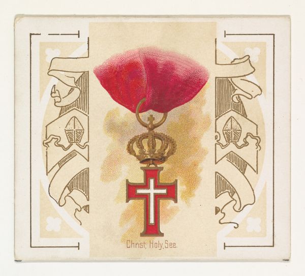 Curator: So, we have here an alluring little card from 1890, part of Allen & Ginter's "World's Decorations" series. It features the Imperial Order of Frances Joseph of Austria, Chevalier. Editor: Ooh, it's striking! Something about that ornate cross set against the aged, pale ground of the card evokes a regal, almost melancholic mood, doesn't it? Very Downton Abbey. Curator: It does. The artist masterfully uses a blend of printmaking techniques—likely including chromolithography—to bring out the details of the medal. The meticulous hatching and subtle color gradations are incredible when you consider the object’s small scale. Notice the cross's arms emanate from the dual-headed eagle, and right above that, the imperial crown, a complex layering of symbolic authority. Editor: And, oh, those eagles, rendered with such precise detail, juxtaposed against the comparatively softer rendering of the red ribbon. I’m caught by the interplay of textures and materials! One might interpret the eagles as symbols of vigilance and power, fiercely guarding the sanctity of the empire. A fascinating composition, truly. Do you think the texture of the ribbon would feel plush and rich if we could reach through time? Curator: Without a doubt. The Formalist in you sees structure, which the artist exploits perfectly, from that carefully composed layout, the decorative borders mirroring the central form, right down to the balance of hues that hold your attention captive. The strategic symmetry here makes you want to salute, no? Editor: Absolutely! And isn't it incredible how a simple tobacco card could embody such complexity? From everyday ephemera to artifacts worthy of display – these little artworks keep revealing subtle clues of what humans once were. Curator: A perfect reminder that greatness can be found in small packages! I find this example interesting for how it showcases fin-de-siècle society's obsession with heraldry and pomp. These decorations served as tools of social definition, illustrating power. Allen and Ginter brilliantly tapped into that with these cigarette cards. Editor: So next time you're lighting up, remember Austria! What a gorgeous piece. Thanks, it was enriching discussing such a subtle example.