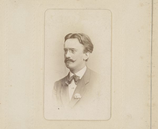 This photograph, "Portret van een man met bril" was made by J.W. Wentzel using a photographic process that was becoming increasingly popular and accessible during the late 19th and early 20th centuries. The sepia tone, a result of the chemical development process, lends the image a sense of nostalgia, while the ornate decorative frame, likely mass-produced, reflects the era's aesthetic sensibilities and growing industrialization. The subject’s formal attire and confident pose suggest a middle-class status, indicative of a society where photography was no longer solely the domain of the elite. Consider the labor involved: from the photographer operating the equipment and processing the image, to the workers manufacturing the frame. Even the subject’s clothing represents the labor of textile workers and tailors. By examining the materials and processes of this photograph, we gain insight into the social and cultural context of its creation, highlighting the intricate connections between art, industry, and society.