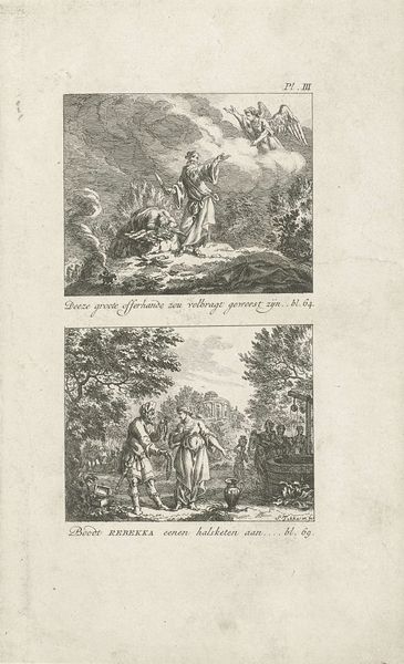 Editor: Here we have "David hears of the death of Saul and Jonathan / The Death of Absalom," an engraving by Noach van der Meer (I) dating from around 1724 to 1769. I am really struck by the starkness of the lines; the process feels very present. What do you see in this print? Curator: It's compelling how the starkness highlights the very labor embedded in printmaking, isn't it? I immediately look at the production of this work. Engraving, unlike other forms of printing, relies on this forceful act of cutting into the metal. This image isn't just *of* historical events; it embodies a physical, laborious process. What do you think this emphasis on material production adds to our understanding of the subject matter? Editor: I hadn't thought of it that way! It makes me think about the power structures inherent in artistic creation, who had access to the materials, tools, and training needed to create an engraving like this. It wasn’t something everyone could do. Curator: Exactly! And consider how these images, likely reproduced and disseminated, participated in shaping the very narrative of these biblical stories. The artist isn’t just illustrating scripture, but actively involved in the reproduction and dissemination of this worldview. It's a far cry from unique painting – which gives engravings a specific place in history of production of art. Editor: So the process of engraving itself adds another layer of meaning and interpretation to these historical narratives. Curator: Precisely. The choice of engraving isn’t neutral. It suggests something about the artist's intended audience, the potential for mass consumption, and even the societal values assigned to laborious processes versus the 'genius' of individual creation in painting. Editor: That’s given me a lot to consider – how the method and material of creation really influence meaning! Curator: It’s a powerful way to think about art: how material and means of production shapes perception.