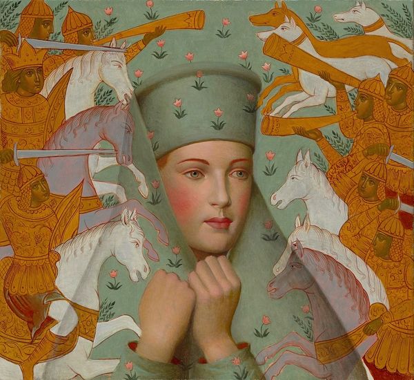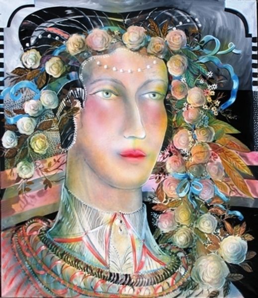 Carlos Sablòn created this painting entitled ‘Coquette’ in 1981. The woman’s elaborate headwear and jewelry link her to Renaissance portraits of wealthy women, where adornment signified status and wealth. Consider how this portrait echoes the headdresses in Ghirlandaio’s paintings from the late 15th century. The 'coazzone' style of elaborate braids and adornments, as we see here, was a display of artistry and affluence. But note the jarring contrast: the woman's piercing gaze, confronting the viewer, set against an abstract background that throws the past into the present. The coazzone, in its original context, signified elegance and status. Here, it becomes a charged symbol in the language of modern art. The image invites us to reflect on how symbols recur, morph, and find new life, and how visual memory shapes our interpretation of art across centuries.
