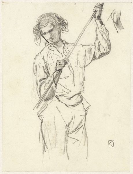 Editor: Here we have "Studie van een man met een hoed op en een stok in de hand" – a Study of a Man with a Hat and Stick – created sometime between 1841 and 1857 by Johan Daniël Koelman. It's a pencil drawing. The image has a casual air, almost as if capturing a fleeting thought in an artist's sketchbook. What stands out to you in this piece? Curator: Sketchbooks, ah, those whispering galleries of the soul! For me, this isn’t just a study, it's a conversation. See how the artist allows us into their process, that glimpse behind the curtain. It feels like the artist is trying to really *see* the subject, figure out how they fit into a bigger picture, quite literally maybe! There’s a raw honesty here, isn’t there? It is a charming glimpse into someone else's internal world! It's beautiful in its imperfection, wouldn’t you agree? Editor: Absolutely! The sketch lines really emphasize that sense of immediacy, like a quick snapshot of a person. But the details, the lines around the eyes, give him such character! I wonder what the artist was intending to capture? Curator: Perhaps Koelman wanted to explore the narrative potential, or a kind of inner theatre! Imagine this figure as a character in a play; this isn't just a man, this is a personality, brimming with untold stories! Did he catch your eye with some strange feature? I want to hear what you think! Editor: Maybe it's the hat! There's a lot of focus and shading there. It is almost like the artist intended this image to show an important detail about the character. Curator: Precisely. Sometimes the clothes really do make the man, huh? You really hit it on the head. So, what do we take away, then? I reckon it is capturing an atmosphere more than rendering a mere likeness. Editor: I see now that these details invite us to co-create a narrative, providing the missing puzzle pieces. Curator: Exactly, so here is an open door, not a locked one, and to that I raise my imaginary glass!