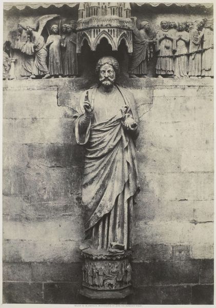 Editor: Here we have Charles Marville's 1856 photograph, "Statue of Clovis, Church of Sainte-Clotilde, Paris". The texture captured in this photograph is incredible; you can almost feel the cool stone of the sculpture. How do you see this photograph in terms of its composition? Curator: The formal elements demand attention. Note the vertical thrust created by the statue's pose, the architectural niche, and the pedestal. This linearity is subtly countered by the drapery's soft folds, creating a visual push and pull. The light, raking across the surface, highlights the sculpture's texture and form, articulating depth and volume. How does this interplay contribute to your interpretation? Editor: Well, the contrast makes it really pop. It's like the sculptor is really trying to make sure you can't miss the detail, despite it being part of a larger building. Do you think that idea carries through to how the artist of the photo is thinking, as well? Curator: Precisely. Marville’s choice of lighting directs our focus, underscoring the statue’s inherent qualities. Further, examine the positioning of Clovis within the frame; the careful arrangement amplifies the inherent monumentality of the statue. Do you perceive a dialogue between the photographic medium and sculptural form? Editor: I think so! The photo is kind of flattened, in a way that sculptures, which are three dimensional, are not, but there are definitely many aspects of the form preserved here. I hadn't thought of the way the light contributes to that! What’s been most interesting for me is tracing how the materiality of the original sculpture translates and is transformed through photography. Curator: Indeed, that relationship is paramount. We gain insight into the qualities inherent in each distinct artistic form. The photograph encourages careful, close observation.