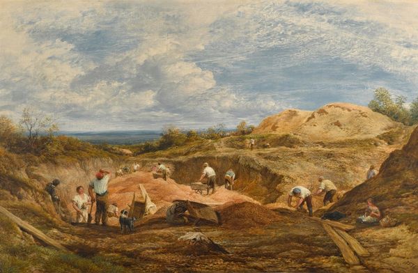 Editor: Here we have Peter De Wint's "A Cornfield," a watercolor piece. The human figures seem dwarfed by the landscape, a bit melancholic even. What strikes you about it? Curator: The materiality speaks volumes. De Wint's choice of watercolor, its ready availability and ease of use, democratized landscape painting. He’s depicting labor; can we ignore the social context of agricultural work in 19th century Britain and the commodification of rural life? Editor: I hadn't thought of it that way. So, the medium itself connects to the work's subject? Curator: Precisely. The accessibility of watercolor mirrors the availability, and exploitation, of labor. And the landscape itself? Is it romanticized, or a stark depiction of agricultural production? Editor: It’s both beautiful and, now that you mention it, unsettling. I’ll definitely consider the materials and their historical context more. Curator: A worthwhile exercise. Examining the means of production is crucial to understanding any artwork.