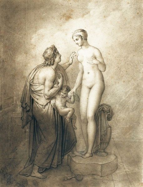 Curator: Edward Burne-Jones created this artwork titled, "Pygmalion And The Image – The Hand Refrains" in 1878. It is painted in oil. Editor: A rather somber encounter, wouldn’t you say? The color palette is muted, and there is a pervasive sense of hesitation. The sculptor and his creation both seem frozen, almost afraid to connect. Curator: Precisely. Consider the socio-economic conditions. Burne-Jones, aligning with the Pre-Raphaelite Brotherhood, consciously rejected the industrialization and mass production that dominated Victorian England. He turns back to a past of craft, a history when handmade objects carried inherent value, challenging the division between ‘art’ and ‘craft’ upheld by capitalist modes of production. Pygmalion’s painstaking creation, therefore, mirrors the artist’s own dedication to labor-intensive artistry. Editor: But even considering all the conditions of its making, there's more to it than that. It's beautifully rendered, particularly the interplay between the cool marble-like tones of the statue and the warmer flesh tones of Pygmalion himself. Notice the careful composition and use of light to further differentiate the two characters while linking them emotionally through shared glance. Curator: A deliberate juxtaposition, to be sure. But what truly captivates me is the representation of artistic labour. See, Burne-Jones does more than just retell a myth; he reinterprets it, putting an emphasis on artistic creation and the labor behind this piece and what the piece itself is doing to depict manual work and materiality. Editor: And the tension is palatable. I see how the formal structure itself emphasizes their distance, not just emotional but physical as well: between art and life, artist and object. His reluctance feels embedded into every deliberate compositional element. Curator: It begs us to look beyond the myth itself. Pygmalion’s labor, manifested in clay and stone, reminds us of art’s physical presence as commodity, and further it challenges the artist and consumer of art to reconcile creative integrity with the demands of an increasingly industrialized market. Editor: A rather comprehensive encounter, wouldn’t you say? So full of tension that is translated visually through all aspects. The painting's aesthetic properties themselves speak volumes about longing and irresolution. Curator: A productive reading that I feel is anchored in historical and social realities—it truly deepens our understanding and appreciation.