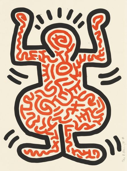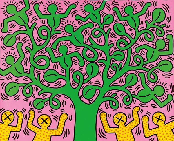 Keith Haring made this painting, Keith and Julia, with acrylic on canvas. Haring emerged from the vibrant New York art scene of the 1980s, amidst a period marked by the AIDS crisis and a renewed focus on social activism. His work often addressed themes of sexuality, life, and death, all within the visual language of street art and pop culture. In Keith and Julia, two figures face each other against a bright yellow background. Haring's unmistakable bold lines and vibrant colors create a sense of energy and immediacy. The figures themselves appear almost robotic, their bodies constructed from geometric shapes and patterns. Communication, symbolized by the blue stream between them, is a central theme here, though the nature of their exchange remains ambiguous. Haring himself noted that his art was about "life and creating something that was going to be alive." This piece exemplifies Haring's ability to transform personal concerns into a universal commentary on connection and existence, reflecting the anxieties and hopes of a generation grappling with profound social changes.