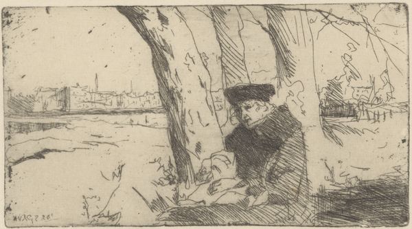 This is Johannes Tavenraat's pen drawing "Hunter with Dog," now held at the Rijksmuseum. Tavenraat was working in the Netherlands during a time of significant shifts in social and economic structures. His art often captured scenes of daily life, reflecting an interest in the working class. Here, we see a hunter resting against a tree with his loyal dog beside him. The scene might seem simple, but it subtly touches on the dynamic between man and nature, and the roles they play in shaping each other. The hunter, likely a working-class individual, relies on nature for his livelihood. The dog, a symbol of loyalty and companionship, is also a working partner, crucial for hunting. In the background, a family is depicted. Are they travelers or locals? Their presence introduces questions about community and the shared use of the land. Tavenraat invites us to reflect on the intertwined narratives of labor, companionship, and the land that supports them all.