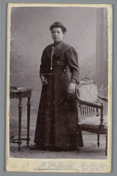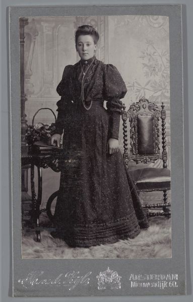 Veldhuyzen & Co. of Amsterdam created this photographic print titled "Portret van een onbekende vrouw staande naast een vaas met een droogboeket." Let's consider how this image participates in the history of photography. The woman's formal pose, the studio backdrop, and the bouquet all signify established visual codes of the time, most likely the late 19th century. Photography at this time was becoming more accessible, so the emerging middle classes had the opportunity to represent themselves through portraiture. What is most striking, however, is the dried flower arrangement, with its dark connotations. The 'memento mori' theme reminds us that beauty fades and death awaits us all. As art historians, we can consult sources such as photography journals and social histories to understand the rise of commercial photography studios like Veldhuyzen & Co, and the changing social dynamics of portraiture at this time. By understanding the socio-cultural context, we can understand this photograph as an object of individual expression.