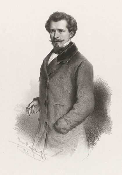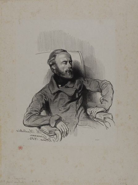 Curator: My first impression is: This fellow looks like he's about to tell me a long, winding story about the sea, maybe involving a lost ship or two. Editor: That's precisely the kind of character brought to life in this print, “C. F. Sørensen,” dating from 1877 to 1881. It's held here at the SMK, the Statens Museum for Kunst. The artist captured Sørensen's likeness through engraving, a meticulous process that utilizes graphite for stunning detail. Curator: Engraving, huh? You can really see it in the cross-hatching that builds up the shadows. And that texture! His tweed jacket practically feels like it's scratching against the back of that poor chair. Editor: Indeed, the textural rendering achieved with simple lines is extraordinary. Consider the semiotics at play: the subject's confident pose with his pipe symbolizes authority and experience, contrasting subtly with the gentle sadness etched around his eyes. The gaze establishes a connection, drawing us in for introspection. Curator: Introspection for sure. I bet Sørensen was quite a character. A dreamer, perhaps. You know, I wonder what was on his mind as the artist worked. Maybe he was thinking about the next grand adventure, or maybe he was contemplating mortality and the relentless march of time? He's really daring you to guess. Editor: I appreciate how this engraving avoids stark realism, inviting interpretation instead. There’s a dance of light and shadow on his face that transcends pure representation, bordering on expressive. What stands out for you the most aesthetically? Curator: I would have to say the beret, a slightly rakish beret at that! Perched just so. And then the pipe, anchoring his hand but creating the focal point. What starts off looking simple unfolds layer by layer. Editor: Agreed. Its genius truly resides in its simplicity. A subtle orchestration of form and meaning that makes the portrait memorable. Curator: So here's to the long stories only old salts like Sørensen can spin. May we all find the adventure, maybe even a beret or two, and find the perfect spot from which to tell them. Editor: I hope visitors walk away contemplating the simple sophistication found when masterful strokes capture not just a likeness but the complex tapestry of human experience.