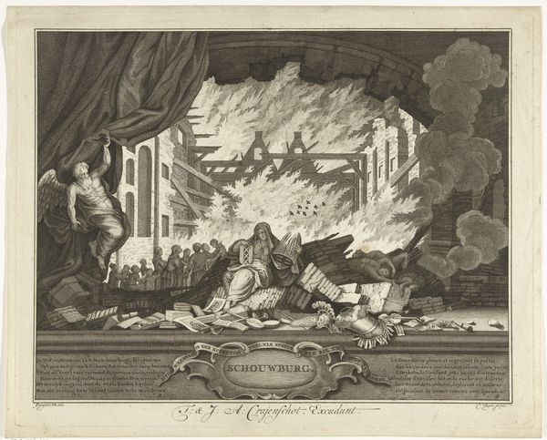 Reinier Vinkeles created this engraving, titled "Brand te Hilversum," in 1766, using etching and burin. The dramatic scene of a village fire is immediately striking, dominated by vertical lines of leaping flames contrasting with the panicked figures below. The composition is structured to draw the eye upwards, from the chaos of the foreground to the inferno engulfing the buildings. Vinkeles uses a semiotic system of light and shadow to convey not only the intensity of the fire, but also the emotional turmoil of the villagers. Notice how the textures are rendered; the dense, dark strokes indicating smoke and devastation, versus the finer lines used to depict the figures' frantic movements. This work destabilizes the typical picturesque landscape of the period, injecting a harsh dose of reality. It reminds us that even in seemingly idyllic settings, chaos and destruction can erupt. The formal tension between the detailed rendering and the overwhelming scene of disaster serves to emphasize the precariousness of life.