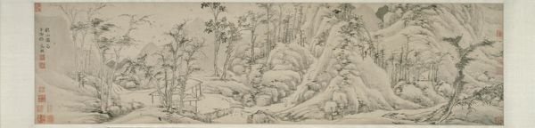 Curator: Standing before us is Shen Zongjing's evocative ink drawing from 1705, aptly titled "The Soughing of the Wind in the Pines Echoes the Melody of Spring." It's a hanging scroll, currently housed right here at the Minneapolis Institute of Art. Editor: It strikes me as almost monochromatic, a hushed landscape where the wind itself seems to whisper through the pines, doesn’t it? There's a stillness, a meditative quality to the way the ink defines form and space. Curator: Indeed, and it's important to understand the context of landscape painting in China. This isn't just about depicting scenery; it's about conveying philosophical ideas, a harmonious relationship between humanity and nature. The individual dwarfed by these massive peaks reflects Confucian ideals of humility and Taoist appreciation of the natural world. Editor: Do you think that humility is reflected in the lack of color? Because even without vibrant hues, there’s so much movement, such dynamic energy. The way the artist uses line… It feels like I can sense the air currents around those mountains. Curator: Exactly. The controlled chaos of the brushstrokes, the varying ink densities – these techniques aim to capture not just the visual likeness of the scene but its very essence. Editor: It almost feels subversive, in a way. The emphasis on negative space, on the subtle nuances of ink wash, moves beyond the hyper-masculine heroic narratives so common in much Western art of the time, instead privileging quiet observation and interconnection. Curator: A counter-narrative that celebrated restraint and inward reflection. Even the presence of figures – see that solitary figure on the bridge? They’re integrated into, not dominating, the landscape. Editor: They feel almost ephemeral, ghosts in the landscape. It's interesting how art, especially landscape, can reveal so much about power dynamics, about who belongs, and who is seen. Curator: And in this scroll, the invitation to belong lies in contemplating the harmony of nature. It asks us to listen—to the soughing of the wind. Editor: Absolutely, a reminder that art can transcend representation and become an experience. Curator: Yes, leaving you contemplating something beyond just a visual. Editor: A soundscape, almost. A melody of the spring, even in monochrome.