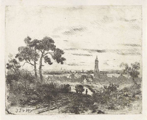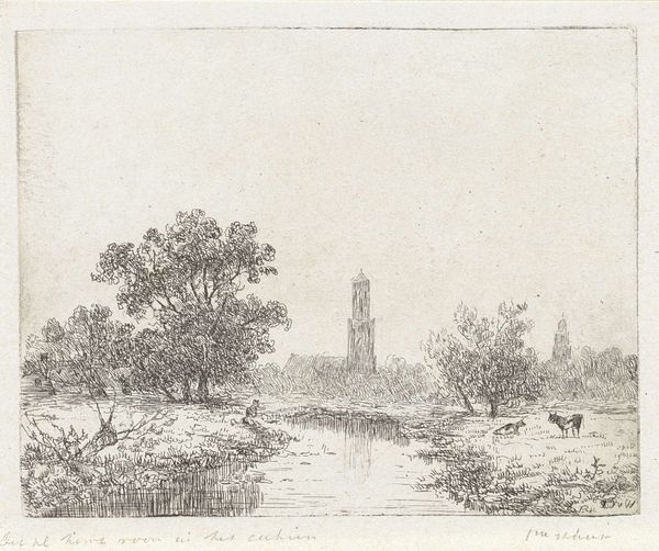 This anonymous etching presents a vista of Utrecht dominated by the iconic Dom Tower. The tower, a symbol of civic pride and religious authority, pierces the skyline, a motif resonant across centuries of European art, from medieval cityscapes to Renaissance panoramas. Note how the tower's reflection shimmers in the water, evoking a sense of ethereal doubling. This reflection, a mirror image, hints at the psychological depth embedded in visual symbols. Consider the Tower of Babel, and the eternal human striving to reach the divine, a theme that echoes in countless works across time. The Dom Tower here embodies not just architectural aspiration but also a collective memory, a visual echo resonating with our subconscious understanding of ambition and perhaps, the inherent risks of overreaching. The tower, then and now, serves as a potent reminder of the cyclical nature of human endeavor.