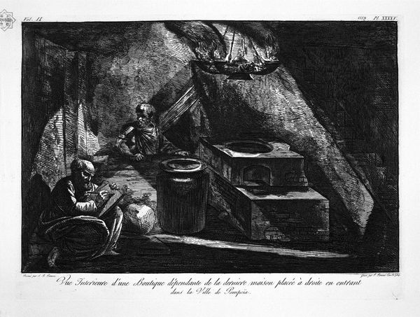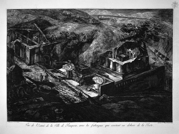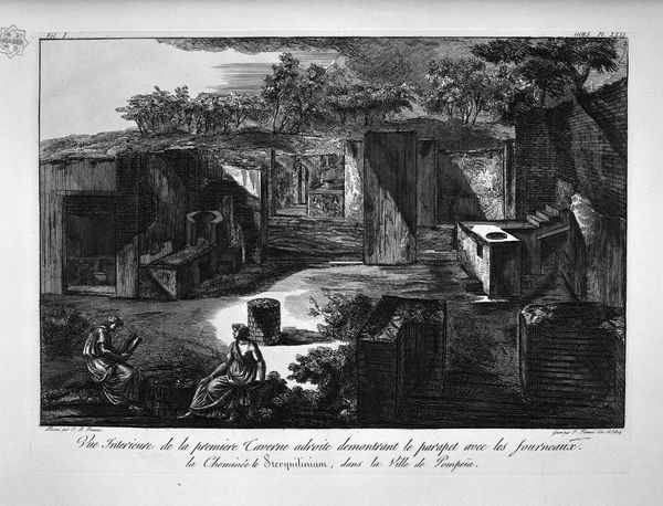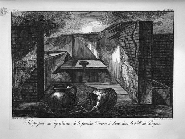 Curator: We’re looking at Giovanni Battista Piranesi’s "Plan and elevation of a restaurant", an etching that captures both a design proposal and a sense of evocative ruin. Editor: It has such a melancholic mood. It is not a welcoming scene, as the deep shadows and fragmented architectural elements imply themes of abandonment or historical reflection. Curator: Absolutely, Piranesi was fascinated with Roman antiquity, particularly the way its grandeur was perceived through the remnants of its architecture. He challenged the utopian ideals of the Enlightenment, creating his signature style by blurring lines between reality and imagination. Editor: I am particularly interested in that solitary figure near the center. They almost seem like an intruder in this grandiose space. It really encourages me to wonder about humanity's role and relationship with architectural legacy, doesn't it? Almost as if the lone man contemplates the space more from a subjective lens. Curator: That's right! The use of perspective plays an interesting part. It draws us into the depths of the composition, as well as making the space feel boundless. We see Piranesi drawing from architectural history while using techniques that were being employed in the world of theater design at the time. Editor: And that sharp contrast. Piranesi has emphasized dramatic qualities. This evokes themes of both human temporality and nature's gradual reclamation. These structural elements suggest a cyclical return, both inspiring and cautionary, regarding progress. Curator: It’s also fascinating to consider Piranesi's prints as precursors to contemporary architectural visualization, demonstrating a blurring of boundaries between art, documentation, and speculation. Editor: Well, the way Piranesi plays with form, light, and scale serves as a powerful reminder that we, too, have an active part to play in continuing historical dialogues and building architectural discourse. Curator: I think that perfectly captures the layers of meaning embedded within this etching! Editor: Absolutely. This reminds us how much can be found in architectural depictions of ruin and restoration when contemplating temporality and cyclical dynamics of urban history.